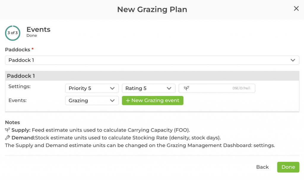 Once you’ve chosen your paddock, you can choose the priority and rating of this event, along with the event type (a dropdown list contains +30 different events from you to choose from). If you click the green button that now appears next to this event, you can choose specific dates for that event to start and end. This is useful to keep track of more than one event in your grazing planner.