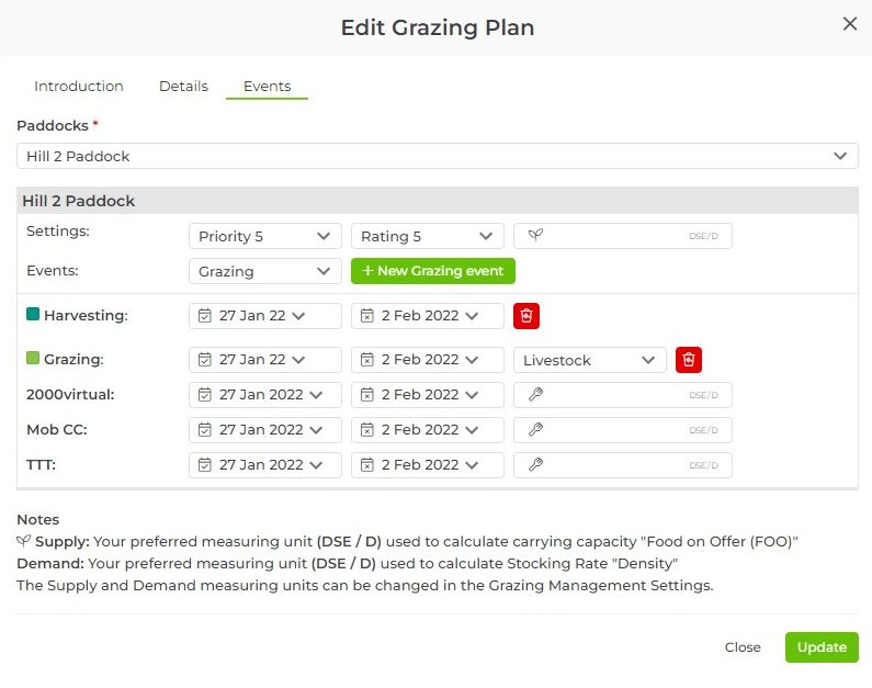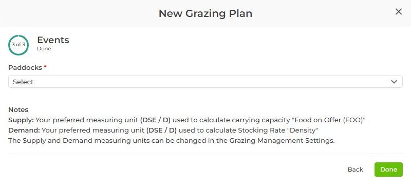If you choose Grazing from the dropdown list of events, and click the green + New Grazing Event button, it will now add grazing to your pop-up box.