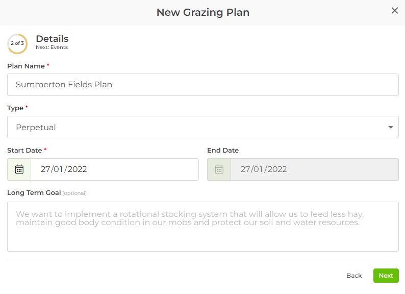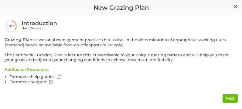 Step 3: A pop-up box will open explaining the grazing plan’s function, along with additional resources that you can click on and read through if you need to. Click Next and fill in the details of your plan (i.e., The plan name, the type – whether it’s perpetual, seasonal or off-season, the start and end date). Click the green Next button once you have filled in all the information.