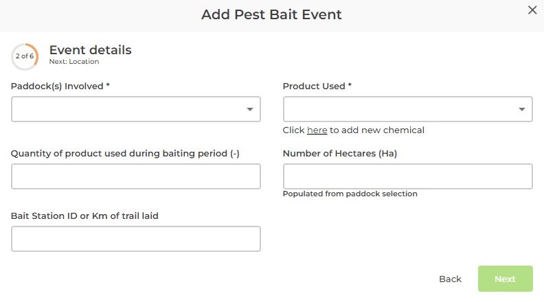Step 4: A series of pop-up boxes will open where you can fill in the pest bait event details. If you cannot go past step 2, you need to create a chemical record first. Click on the “click here to add a new chemical” found underneath the menu bar of Product Used (or read here for the related Help Guide). Add the product used and any other additional information on the box and click Next once you’re done.