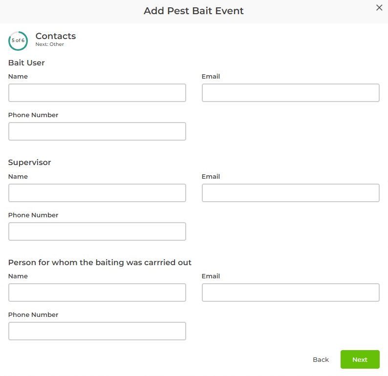 Step 7: Add in the contact details of the pest bait user, supervisor and/or the person who the baiting was carried out for. Click Next to continue.