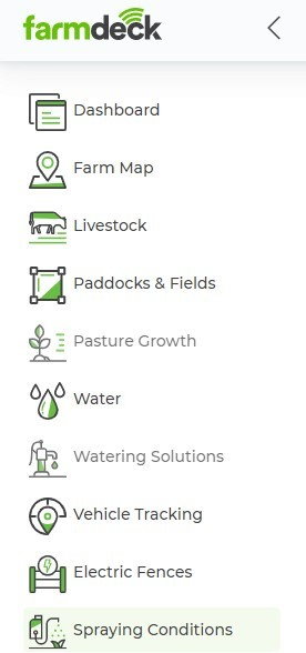 Step 1: Navigate to the main menu on the left-hand side of the page. Scroll down and click on the Spraying Conditions button.