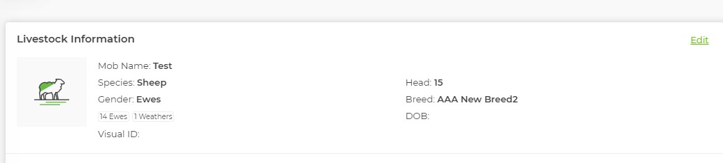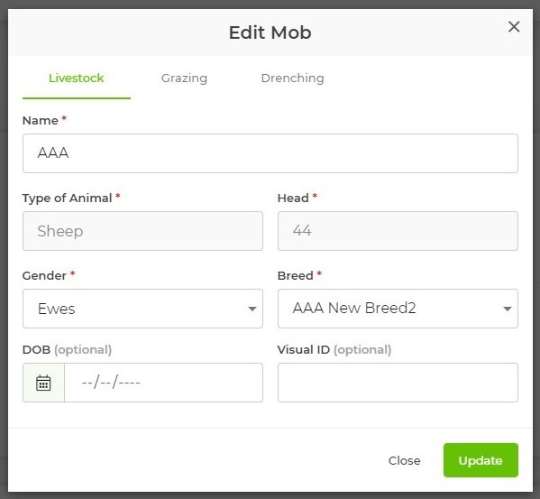 Step 4: A box will open where you can then edit your mob. At the top of the page, you will be able to navigate through the tabs and choose between editing the Livestock, Grazing, or Drenching info.