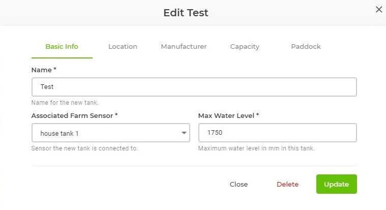 Step 4: In the pop-up box, you will be able to edit the basic info, location, manufacturer, capacity and paddock information of the water resource/sensor by clicking on these headings.
