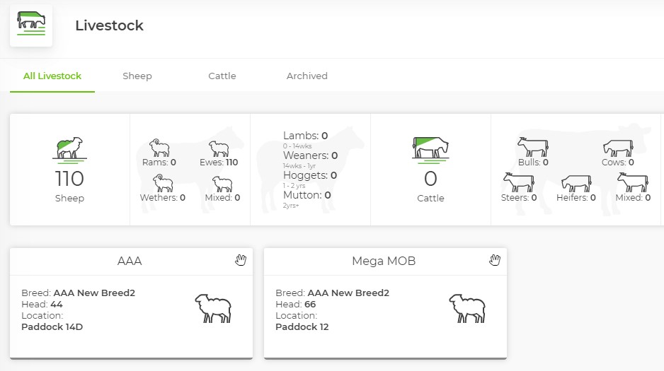 Step 2: When your Livestock main page opens, it will display an overview of the livestock that you have registered on your farm. Underneath that will be the mobs that you have created.