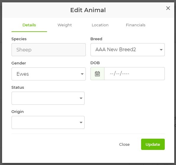 Step 5: A pop-up box will open where you can edit the individual animal’s details. By clicking on the tabs underneath the Edit Animal heading, you can choose to edit Details, Weights, Location and Financials.
