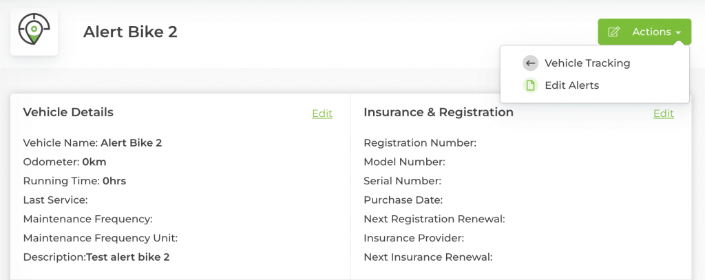 Step 3: Once your vehicle opens, navigate to the right-hand side and click on the Actions button. A dropdown list will open. Click on Edit Alerts.