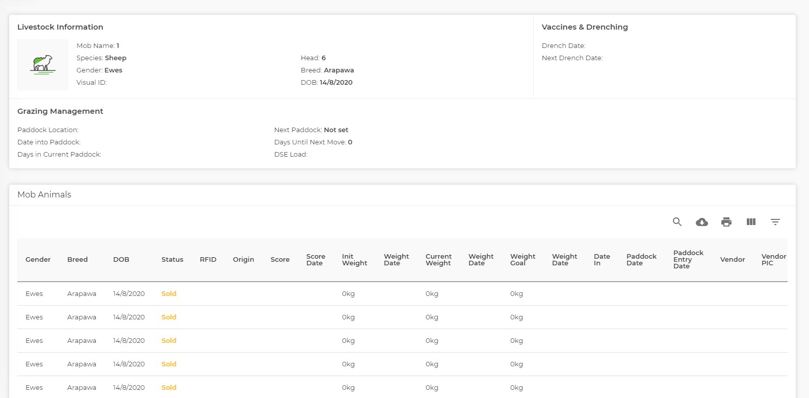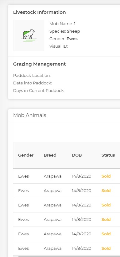 In the Status column, you can see if the mob has been sold, and if it is alive or deceased.